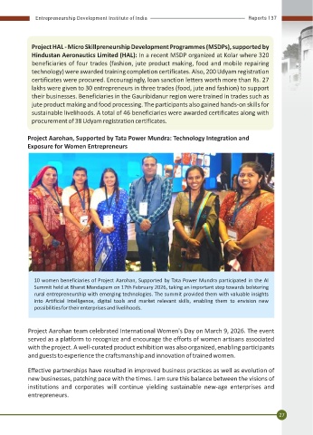 Programmes (EGPs) were conducted in Kamrup, Assam, reaching out to 76 entrepreneurs. 10 women beneficiaries of Project Aarohan, Supported by Tata Power Mundra participated in the AI