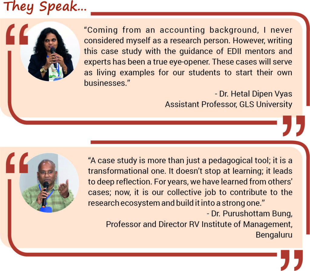 For this competition 70 case leads were received, out of which 49 were accepted. 30 authors participated in the case competition and presented 23 cases in six thematic sessions. The submitted cases were reviewed by Dr. Satyajit Majumdar, Distinguished Adjunct Professor, EDII; Dr. Amitabh Deo Kodwani, Professor, IIM Indore and Dr. Gordhan Kumar Saini, Professor, TISS Mumbai. The competition was initiated under the directions of Dr. Sunil Shukla, Director General – EDII and was coordinated by Mr. Ganapathi, Incharge- EDII Library and Information Centre