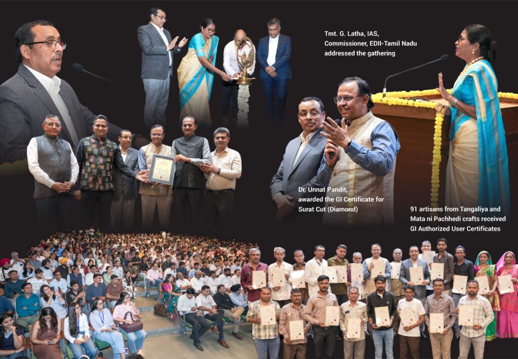 EDII has been actively supporting GI registration for traditional crafts and products. So far, the Institute has facilitated GI tags for five crafts – Gujarat Suf Embroidery, Ahmedabad Sodagari Block Print, Bharuch Sujani Weaving, Surat Sadeli Craft and Surat Cut (Diamond). In addition, the Institute has initiated GI tagging for 15 crafts and agricultural products from Gujarat under MSME IPFC, which are currently in advanced stages of processing.