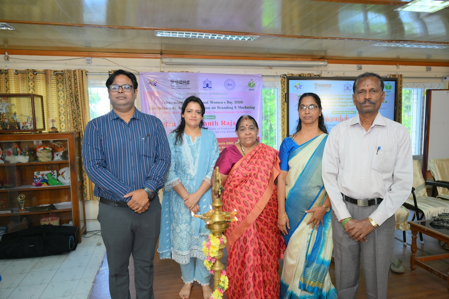 Women’s Day event was graced by distinguished dignitaries, including: (R – L) Thiru. G. Jayaraman, General Manager, District Industry Centre & PIPDIC, Government of Puducherry; Tmt. N. Shajima, Deputy Director, Department of Fisheries, Government of Puducherry; Tmt. Komalavalli, Founder, Sri Krishna Bags, Puducherry; Ms. Bijaya, Proprietor & Co-Founder, Chez Artizan and Mr. Samit Kumar, Faculty, EDII.
