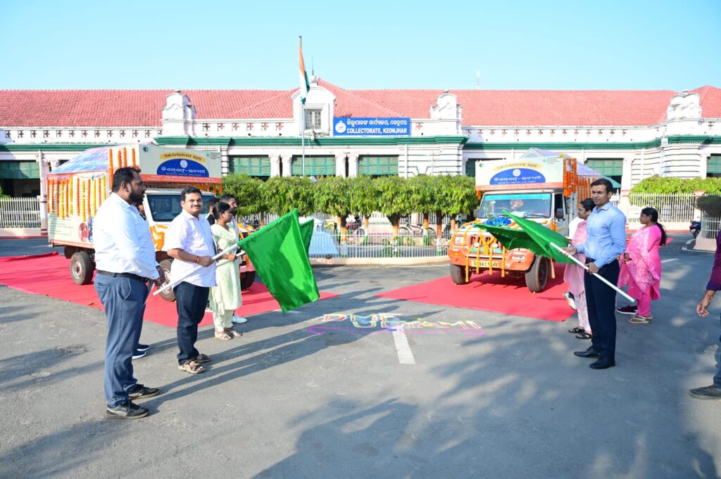 A Rath to educate people about entrepreneurship was flagged off in the presence of the (R) Shri Vishal Singh, IAS, Hon’ble Collector & District Magistrate, Keonjhar; (2nd from R) Dr. Reena Pradhan, IAS, Chief Executive Officer, District Mineral Foundation; (2nd from L) Shri Kumar Nagabhushan, Chief Development Officer-cum-Executive Officer, Zilla Parishad; (3rd from L) Smt. Sudha Oram, District Skill Development & Employment Officer and (L) Mr. Sachikant Mallick, Programme Coordinator, DMF Udyami Project.