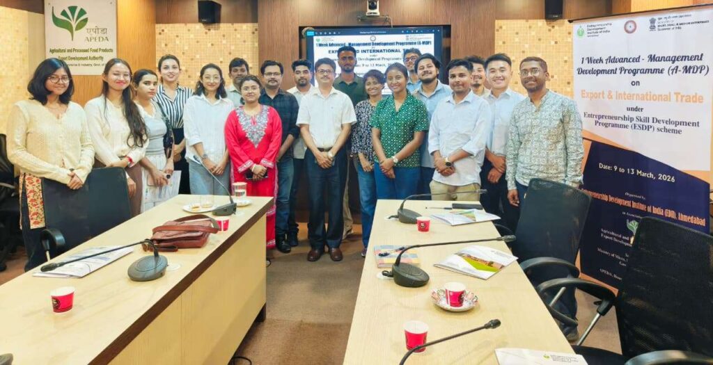 Additionally, a 5-day Advanced Management Development Programme (MDP) on ‘Export and International Trade’ was organized at Guwahati under the ESDP Scheme of the Ministry of Ministry of Micro, Small and Medium Enterprises, Govt. of India from March 9 – 13, 2026. The programme was designed to build capacities of entrepreneurs, professionals and aspiring exporters by providing in-depth knowledge of global trade practices and export procedures. 25 participants from Assam and Meghalaya attended the programme. The sessions covered key topics such as international marketing strategies, trade regulations, quality standards and compliance with international norms.