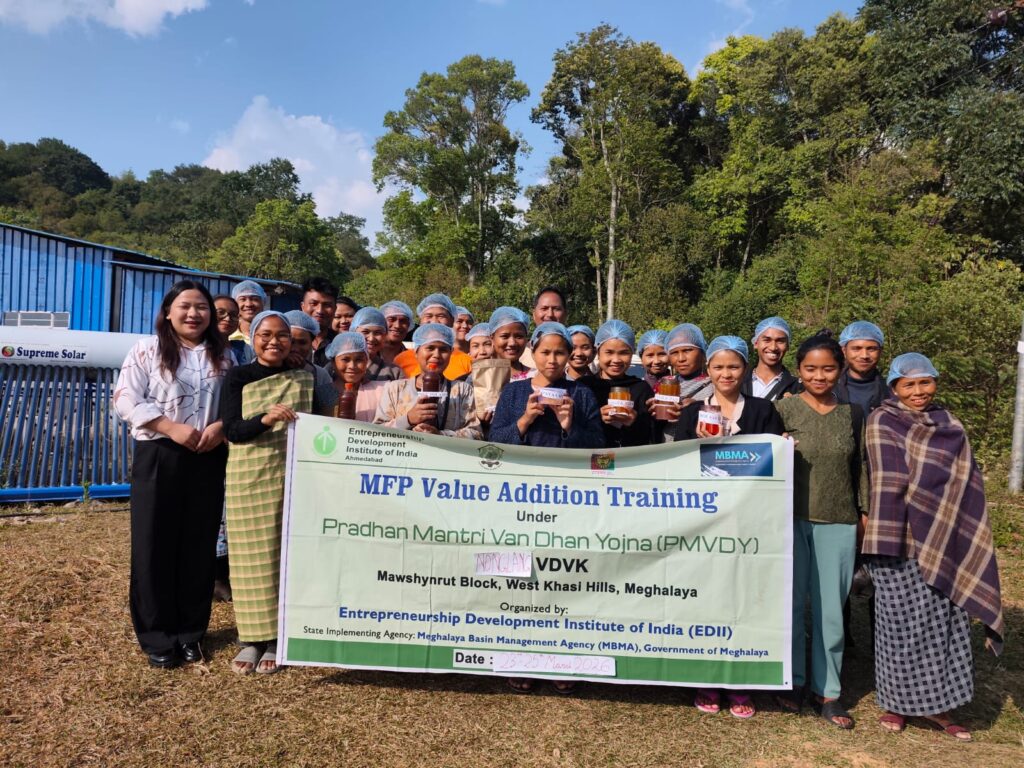 In Meghalaya, EDII serves as the training and capacity building partner for 130 Van Dhan Vikas Kendras (VDVKs). During the last two months, 20 Value Addition Training Programmes on Minor Forest-Based Products (MFPs) were conducted, benefiting 300 participants. These programmes helped participants enhance the quality of their products and make them market-ready. Additionally, 2 Training of Trainers’ (ToT) programmes were organized, where 55 VDVK members received training in Food & Agro Processing and Branding & Packaging. These efforts are strengthening local capacities and enabling tribal communities to build sustainable livelihood opportunities.